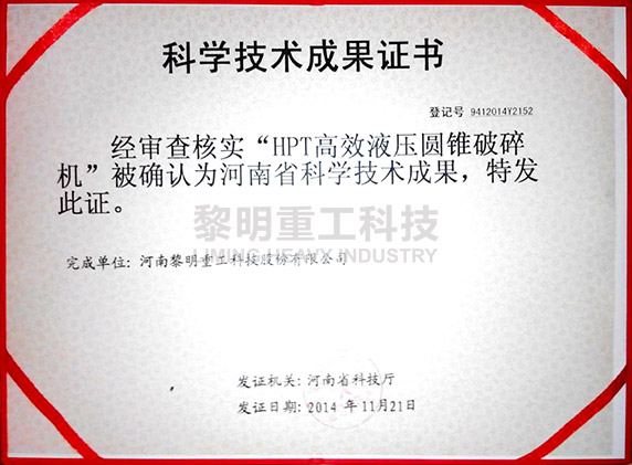 - HPT高效液壓圓錐破碎機獲河南省科學技術成果 >>查看證書