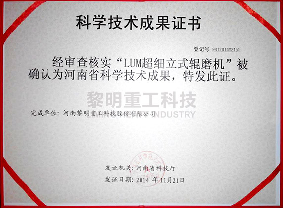 - LUM超細立式輥磨機獲河南省科學技術成果 >>查看證書