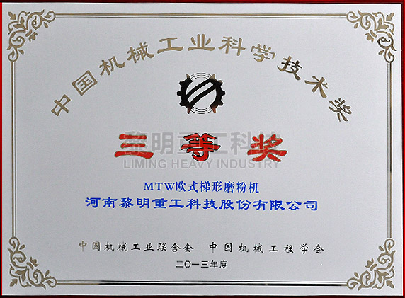 - MTW歐版梯形磨粉機中國機械工業(yè)科學技術獎 >>查看證書