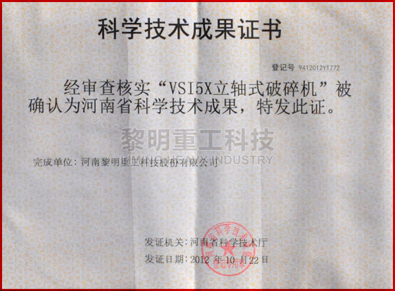 - VSI5X立軸式破碎機獲河南省科學技術成果 >>查看證書
