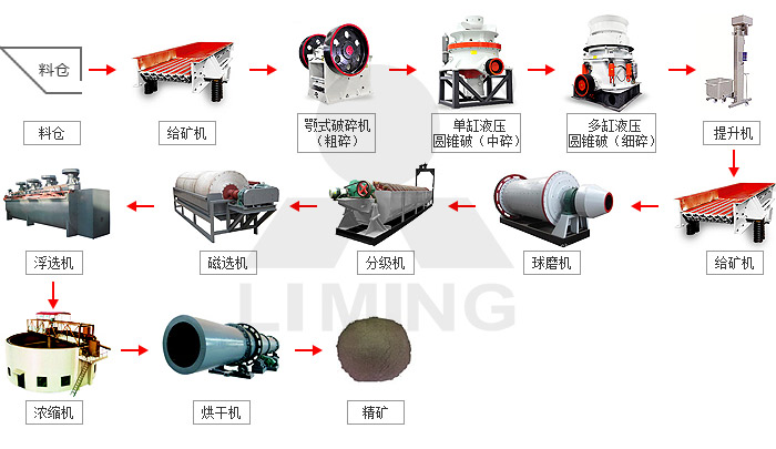 選礦生產(chǎn)線一般分為磁選法和浮選法兩種不同的選取作業(yè)方式,具體流程如下:給礦機(jī)將開采的礦石送入顎式破碎機(jī)進(jìn)行初步破碎,粗破后的礦石由圓錐破碎機(jī)破碎至合理細(xì)度后經(jīng)由提升機(jī)、給礦機(jī)均勻送入球磨機(jī)進(jìn)行粉碎、研磨。研磨出的礦石進(jìn)入分級機(jī)內(nèi),分級機(jī)借助固體顆粒比重不同在液體中沉淀速度不同的原理,對礦石混合物進(jìn)行洗凈、分級。經(jīng)過洗凈和分級的礦物混合料在經(jīng)過磁選機(jī)時,由于各種礦物的比磁化系數(shù)不同,經(jīng)由磁力和機(jī)械力將混合料中的磁性物質(zhì)分離開來。經(jīng)過磁選機(jī)初步分離后的礦物顆粒再被送入浮選機(jī),根據(jù)不同的礦物特性加入不同的藥物,使得所要的礦物質(zhì)與其他物質(zhì)分離開。在所要的礦物質(zhì)被分離出來后,因其含有大量水分,須經(jīng)濃縮機(jī)的初步濃縮,再經(jīng)烘干機(jī)烘干,即可得到干燥的礦物質(zhì)。