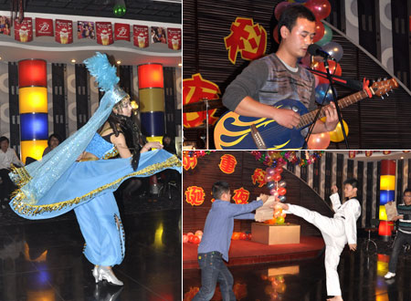 晚會(huì)在現(xiàn)代團(tuán)體舞《快樂寶貝》激情歡快的節(jié)奏中拉開序幕。在隨后上演的眾多節(jié)目中,歌曲串燒、表演秀、神奇魔術(shù)、詼諧小品、武術(shù)表演等幽默勁爆節(jié)目給廣大員工帶來強(qiáng)烈的感官?zèng)_擊,現(xiàn)場觀眾情緒高漲、熱鬧歡騰;接下來,婉轉(zhuǎn)悠揚(yáng)的笛子演奏、夢幻的藏族、新疆舞蹈,以及優(yōu)雅歡快的爵士舞蹈又把晚會(huì)現(xiàn)場帶入另一個(gè)高雅唯美的情感世界。整場晚會(huì),在全體參與人員的共同努力下,通過不同節(jié)奏的變換、不同主題的穿插,為全體同事呈現(xiàn)了一場豐富、豐厚、豐滿的文化藝術(shù)大餐。