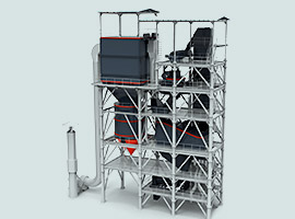 整形制砂系統(tǒng)選用3臺(tái)VUS450骨料優(yōu)化系統(tǒng)。原料通過斗提機(jī)被送入頂樓,由原料輸送皮帶將0~40mm的碎石送入VUS沖擊破,經(jīng)過高頻石打石研磨后進(jìn)入石粉分離室,通過調(diào)整控粉箱進(jìn)風(fēng)口大小和系統(tǒng)風(fēng)量來調(diào)節(jié)制砂含粉量;處理后的物料進(jìn)入分選篩內(nèi)分選出精品碎石、石粉及準(zhǔn)成品砂。其中石粉通過除塵及粉塵收集系統(tǒng)處理后收集為精品石粉,準(zhǔn)成品砂通過加濕攪拌機(jī)均勻拌合后即為精品機(jī)制砂。