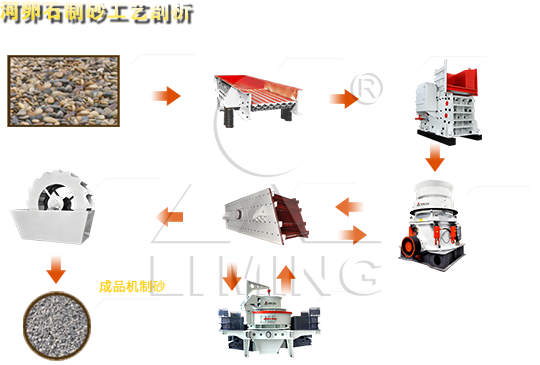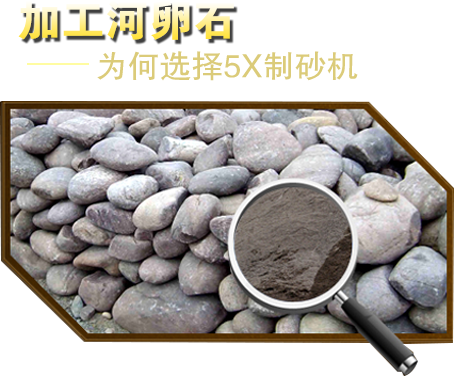 目前河卵石制砂合理的配置是粗碎用顎破,中碎用圓錐破(小產(chǎn)量可用細(xì)顎破),制砂用離心沖擊式破碎機(jī)(5X制砂機(jī))的三級(jí)破碎。