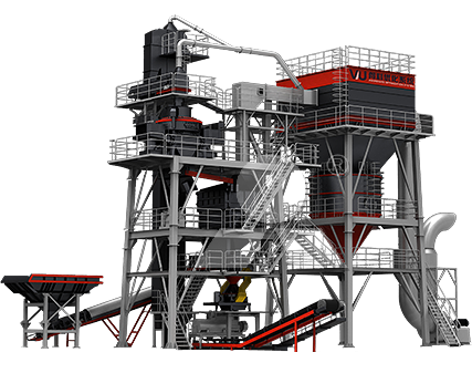 整形制砂系統(tǒng)選用3臺(tái)VUS450骨料優(yōu)化系統(tǒng),原料通過斗提機(jī)被送入頂樓,由原料輸送皮帶將0—40mm的碎石送入VUS沖擊破,經(jīng)過高頻石打石研磨后進(jìn)入石粉分離室,通過調(diào)整控粉箱進(jìn)風(fēng)口大小和系統(tǒng)風(fēng)量來調(diào)節(jié)制砂含粉量;處理后的物料進(jìn)入分選篩內(nèi)分選出精品碎石、石粉及準(zhǔn)成品砂。其中石粉通過除塵及粉塵收集系統(tǒng)處理后收集為精品石粉,準(zhǔn)成品砂通過加濕攪拌機(jī)均勻拌合后即為精品機(jī)制砂。