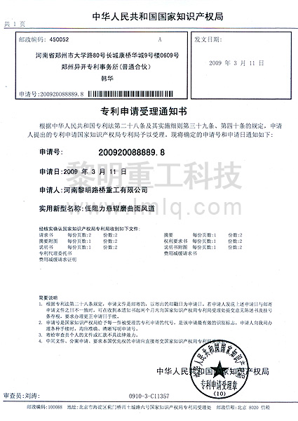 - 低阻力懸輥磨曲面風(fēng)道專利號:200920088889.8 >>查看證書