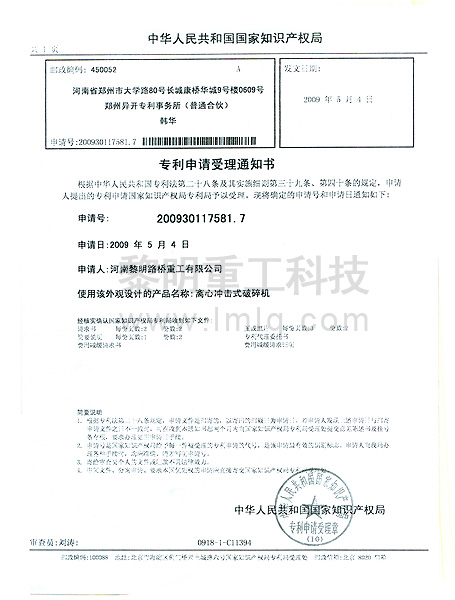 - 離心沖擊式破碎機(jī) 專利號:200930117581.7 >>查看證書