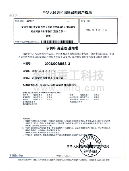 - 立軸沖擊式破碎機(jī)組合式拋料頭專利號:200920088888.3 >>查看證書