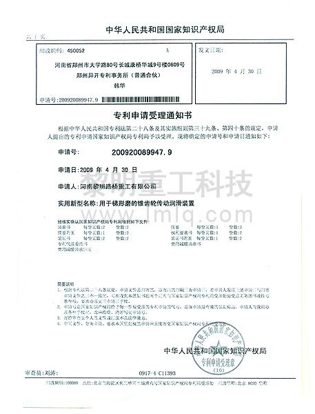 - 用于梯形磨的錐齒輪轉(zhuǎn)動(dòng)潤滑裝置專利號:200920089947.9 >>查看證書