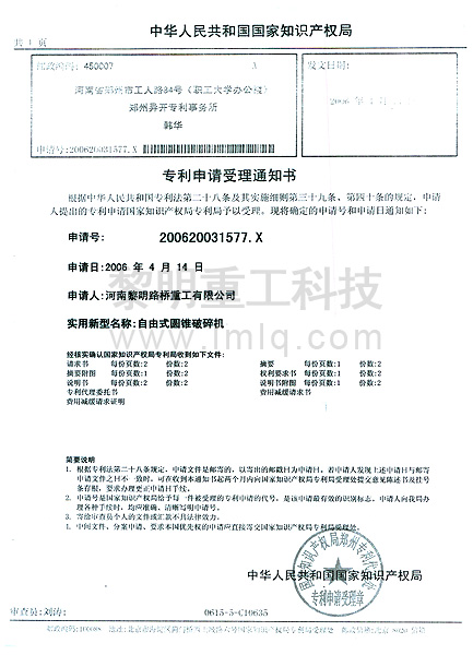 - 自由式圓錐破碎機(jī) 專利號:ZL 200620031577.X >>查看證書