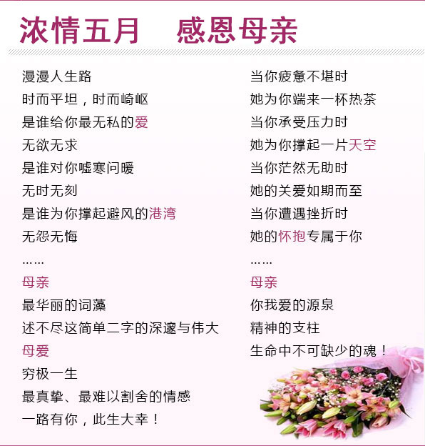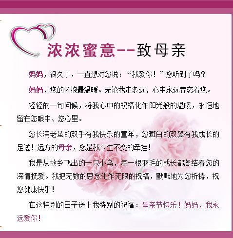 在這特別的日子送上我特別的祝福:母親節(jié)快樂(lè)!媽媽?zhuān)矣肋h(yuǎn)愛(ài)你!