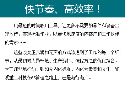 這些改變正以潤物無聲的方式滲透到了工作的每一個細節(jié),從開始對人員環(huán)境、生產(chǎn)資料、流程方法的優(yōu)化組合,大刀闊斧地推動,到如今固化標準,內(nèi)化為素養(yǎng)和文化,黎明重工科技在6S管理之路上,已是漸行漸廣。