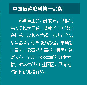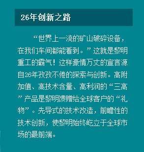 “粗中細超細碎的礦山破碎設(shè)備,在我們車間都能看到?!边@就是黎明重工的霸氣!這樣豪情萬丈的宣言源自26年孜孜不倦的探索與創(chuàng)新。高附加值、高技術(shù)含量、高利潤的“三高”產(chǎn)品是黎明饋贈給全球客戶的“禮物”。先導式的技術(shù)改造,前瞻性的技術(shù)創(chuàng)新,使黎明始終屹立于全球市場的前端。