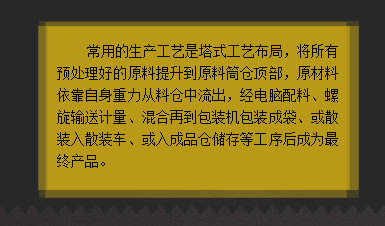 常用的生產(chǎn)工藝是塔式工藝布局,將所有預(yù)處理好的原料提升到原料筒倉頂部,原材料依靠自身重力從料倉中流出,經(jīng)電腦配料、螺旋輸送計量、混合再到包裝機(jī)包裝成袋、或散裝入散裝車、或入成品倉儲存等工序后成為產(chǎn)品。