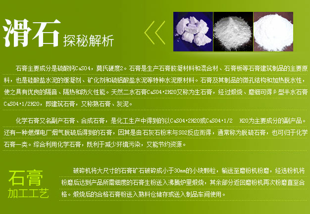 石膏主要成分是硫酸鈣CaSO4,莫氏硬度2。石膏是生產(chǎn)石膏膠凝材料和混合材、石膏板等石膏建筑制品的主要原料,也是硅酸鹽水泥的緩凝劑、礦化劑和硫鋁酸鹽水泥等特種水泥原材料。石膏及其制品的微孔結(jié)構(gòu)和加熱脫水性,使之具有優(yōu)良的隔音、隔熱和防火性能。天然二水石膏CaSO4.2H2O又稱為生石膏,經(jīng)過(guò)煅燒、磨細(xì)可得β型半水石膏CaSO4.1/2H2O,即建筑石膏,又稱熟石膏、灰泥。