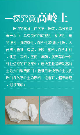 質(zhì)純的高嶺土白度高、質(zhì)軟、易分散懸浮于水中,具有良好的可塑性、粘結(jié)性、電絕緣性、抗酸溶性、耐火性等理化性質(zhì),因此成為造紙、陶瓷、橡膠、塑料、耐火材料、化工、涂料、醫(yī)藥、國(guó)防、航天等數(shù)十種行業(yè)的礦物原料。造紙工業(yè)是精制高嶺土大的消費(fèi)部門(mén)。造紙用煅燒高嶺土以品質(zhì)良好的煤系高嶺土為原料,經(jīng)選礦、超細(xì)粉磨、煅燒而成。