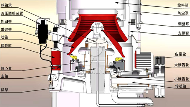 HPT液壓圓錐破碎機主要由機架部、支撐套部、調(diào)整環(huán)部、動錐部、偏心套部、傳動部和保險裝置部七大部件組成,主軸固定,電動機帶動傳動軸旋轉(zhuǎn),傳動軸通過齒輪帶動偏心套繞主軸旋轉(zhuǎn),再由偏心套帶動動錐部做偏心圓周擺動,從而實現(xiàn)連續(xù)的擠壓破碎石塊。