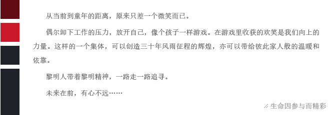 對(duì)運(yùn)動(dòng)會(huì)的憧憬,似乎斷在了畢業(yè)照的咔擦聲里。初入職場(chǎng)的你,每天在手忙腳亂里一點(diǎn)點(diǎn)褪去學(xué)生氣. 三年后的你, 工作節(jié)奏終于從容,激情卻隱在時(shí)光里;在職場(chǎng)馳騁過十年,白駒過隙里你嘆著氣恐懼著中年危機(jī)。是你嗎?不該是你!因?yàn)樵谶@里,青春,不畢業(yè)! 無數(shù)個(gè) 精彩瞬間 值得鐫刻 看起來些許幼稚的游戲卻讓一群人脫下工裝,如孩童般歡呼跳躍。和有趣的人一起做有趣的事,快樂從未這樣簡單過。 我的榮譽(yù)是 身旁 有你 是相遇的那份慶幸,讓彼此都活得盡興。 是你們,陪著我一起鬧,一起笑,一起忘掉不快,享受現(xiàn)在。