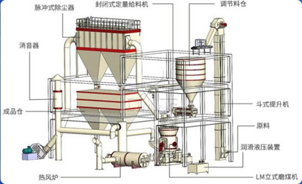 由熱風(fēng)爐出來(lái)的熱風(fēng)或廢氣,在系統(tǒng)風(fēng)機(jī)的抽引下,進(jìn)入立式磨煤機(jī),與磨內(nèi)被粉磨的原煤進(jìn)行充分熱交換后,帶起煤粉在分離器處進(jìn)行分選,細(xì)度不合格的粗煤粉重新落到磨盤上進(jìn)行粉磨,合格的煤粉隨氣流進(jìn)入防爆氣箱脈沖收塵器被收集下來(lái),經(jīng)過(guò)分格輪卸入煤粉倉(cāng)。